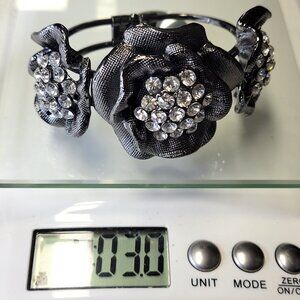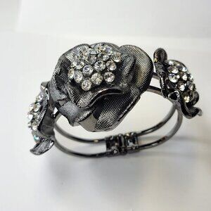 In a hematite tone, this gorgeous hinge cuff bracelet bangle is adorned with 3 double layered petals with a stunning cluster of sparkling crystals in the middle