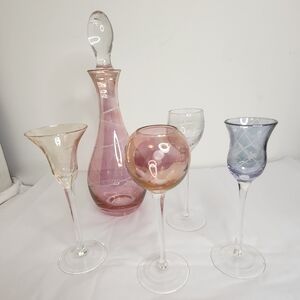 Vintage 1990s, 6 piece Set Features pastel hues and a variety of shapes, pink polkadot Merlot goblet is the cutest, a couple small scratches and a spider crack on the stopper.