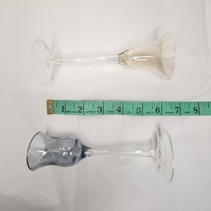 Vintage 1990s, 6 piece Set Features pastel hues and a variety of shapes, pink polkadot Merlot goblet is the cutest, a couple small scratches and a spider crack on the stopper.