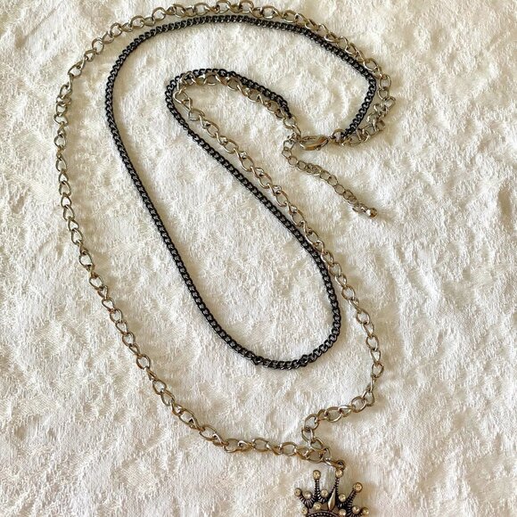 Crystal Encrusted Crown Silver-Tone and Black Tiered Necklace EUC