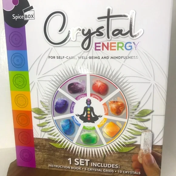 Brand new! Spice box brand Includes instruction book, 8 assorted crystals, 2 crystal point wands, bag, and 5 crystal grids!
