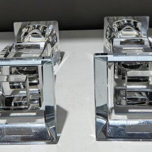 Pair of solid clear crystal glass candle holders, each approx. 12.7 cm tall and weighing ~280-290 g. Modern geometric cube-stack design, clean beveled facets, heavy feel and excellent clarity.