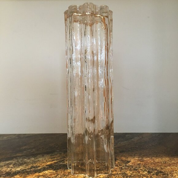 Good preowned condition crystal glass cylinder light pendant. There are some bubbles and imperfections in the glass. I don't think it is Murano glass as there is no stamp and there is some patterning that seems manufactured to me, but I could be wrong. Has some substantial weight. I have six for sale in different states of condition. This one is in very good condition except for a little nick at the opening on one of the flutes. Silver loop for hanging.