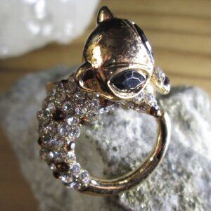 Clear and brown crystals gold tone cat ring with large black crystal alien like eyes. Adjustable band with minimum ring size 7.