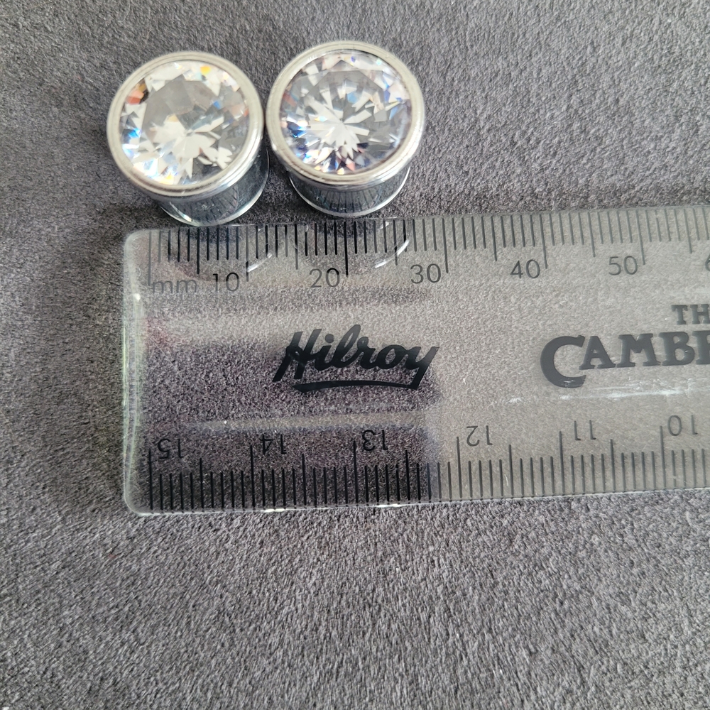 Pair of ear plugs with large clear faceted crystals. 1/2 Inch flare back with indent (no o-ring)