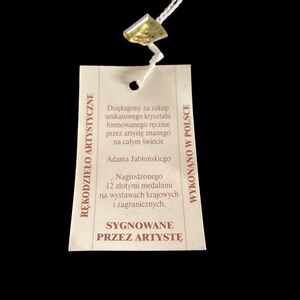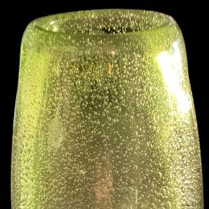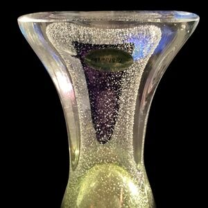 Exquisite vintage crystal vase, signed by the artist, Adam JABLONSKI. The 15 in. tall vase is in clear, yellow and purple with controlled bubbles throughout. The vase is in like new condition, no chips or cracks. It is truly a piece of art!