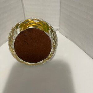 Height 3”. Colors: aurora borealis, blue. Material: cut crystal with gold metal neck. Screw top with 1.8” applicator. Empty does not contain perfume. Condition: good.