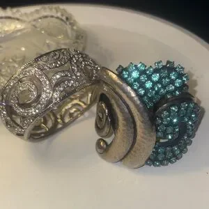 This elegant jewelry set features a stunning silver bracelet and a bold teal cuff. Perfect for adding a touch of sophistication to any outfit.
