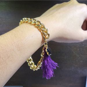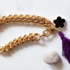 Cuban style bracelet, stainless steel 10kt gold plated color with black enamel charm and cotton tassel.