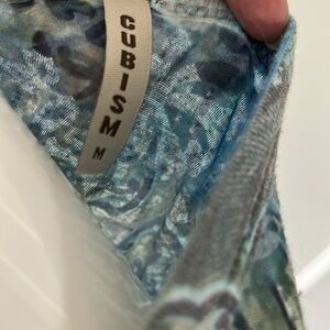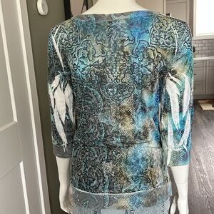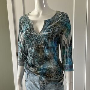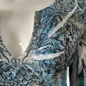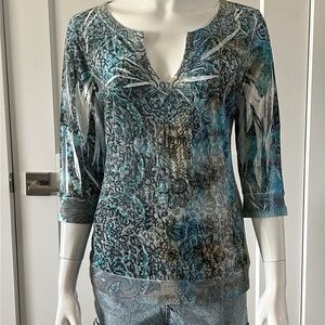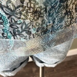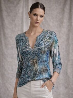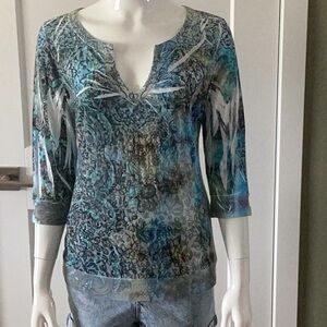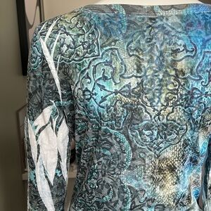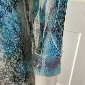 Lightweight spring and summer top in an abstract floral. Beautiful blue tones mixed with mauve, green, and whites.