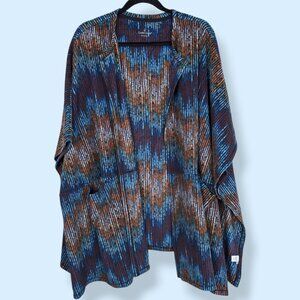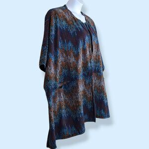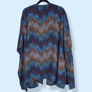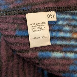 This blanket poncho combo by Cuddl Duds is made of a polyester/spandex blend (94/6) and is VERY, very soft. The fabric features a vertical line pattern with blue and red tones. When laid flat, the piece is like a large rectangle with a slit down the center of the front. The neckline is round and there is a stitch on either end to make a loose interpretation of a sleeve. There is a large pocket on either side of the front as well. This piece really is like a blanket and there is a lot of extra fabric to pull around yourself on cold days. The piece has little wear and certainly hasn't been washed - the fabric is still as soft now as the day it was made.