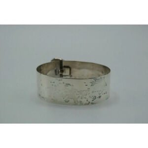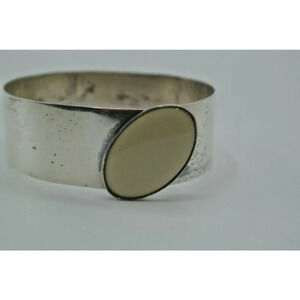 A vintage sterling silver bracelet, stamped "925 JPA." Flat oval stone in a whitish yellow color, installed on an angle - much whiter than the photos show. This item is slightly tarnished, but in very good condition. The diameter measures ~2" so it is for a smaller write. See photos for a closer look! Weight: 20 grams.