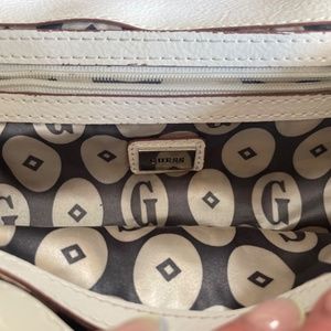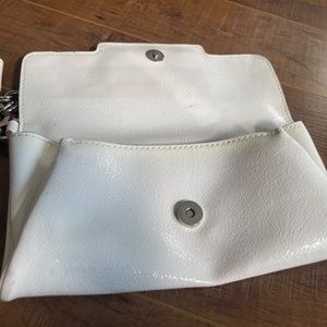 Pre loved guess cuff clutch bag. Used a few times. Has a bit of yellowing on the rim on the open part. Shows in photos. White soft pleather.