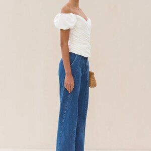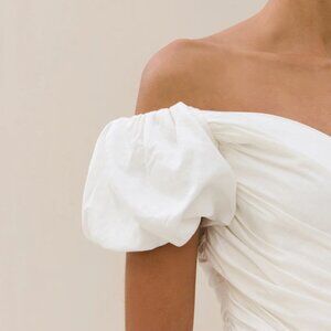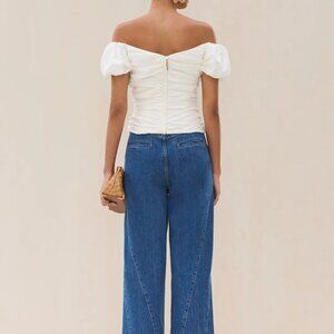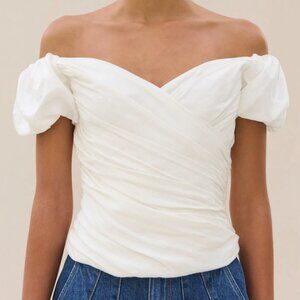 An off-the-shoulder chintz linen wrap top with inner corset and puff sleeves. It's brand new and never worn. It also still has the tags on it.
