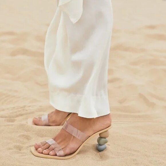 The Meta Sandal balances on a sculptural stacking stone heel and has two clear vinyl straps to keep your foot comfortably in place. So easy to slip in and out of when the party transitions outside.