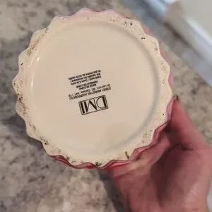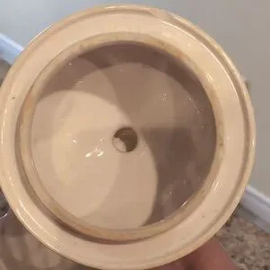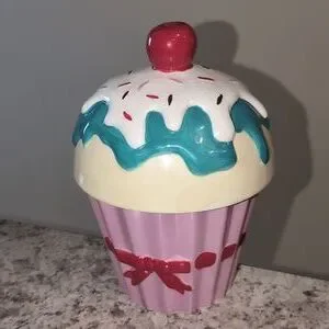 ceramic cup cake cookie jar. well loved looking for something new. there are a few chips/scratches as seen in photos, happens when you have had something for 10years. there has always been a piece of the ceramic at the bottom, it's sanded down won't cut anyone putting their hands in the jar.