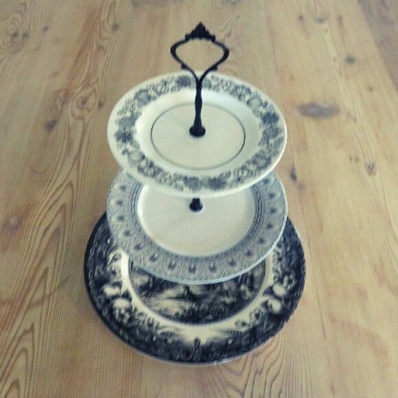 This beautiful Black Plate Cake Stand is made from mismatched Transferware and China plates, with black heavy duty hardware. Perfect for weddings, showers or afternoon tea when you want something special to serve dainties, sandwiches, candy or appetizers. These versatile stands are also perfect for just sitting on your kitchen counter or island as a display item, and they make great gifts!