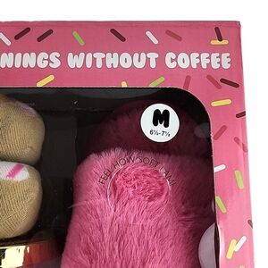 New with tags,Cupcakes Cashmere "I Donut Do Mornings Without Coffee" boxed gift set which includes one pair of slippers (shoe size 5-6), 2 pairs donuts crew socks (9-11) and one 16oz 16oz iridescent tumbler.