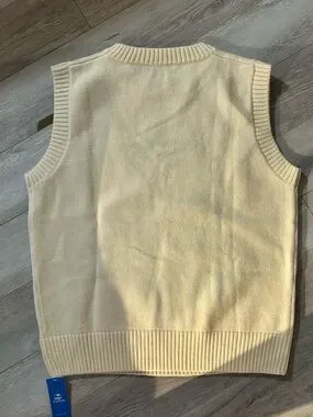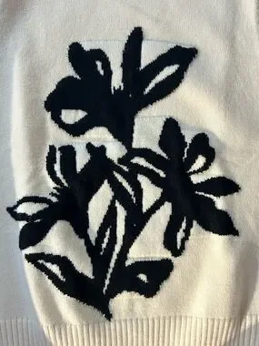 Sleeveless cream knit vest with bold black floral intarsia on front. Crew neckline and ribbed hem. Soft textured knit. Stylish layering piece.