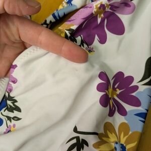 Stylish floral swimsuit with a deep V-neck. Features vibrant blue and purple flowers on a white background.