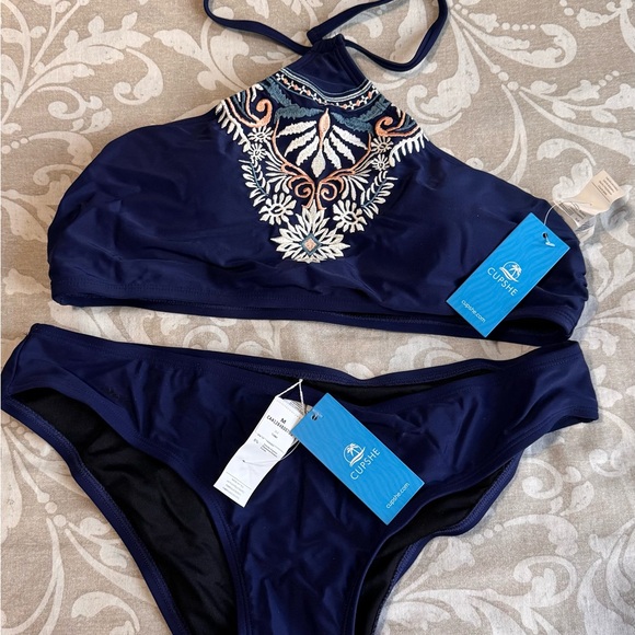 Dive into style with the Cupshe Navy Embroidered Bikini Set. Featuring intricate embroidery, this swimwear is perfect for a chic beach look.