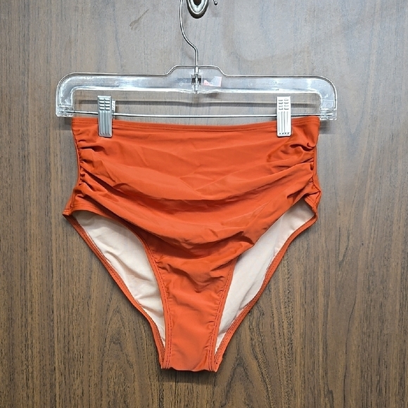 New without tags, no flaws seen. Cute, rusty orange coloured, high waisted bikini bottom with wide waistband that has rouching on both sides. Perfect for the pool, beach or vacation. Shell is 80% nylon-polyamide, 20% spandex. Lining is 92% polyester, 8% spandex.