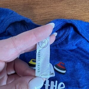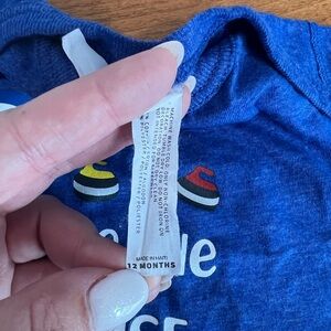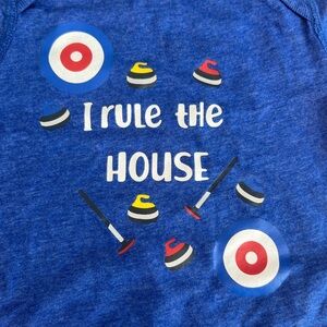 Calling all curling fans! This blue one piece bodysuit has a vinyl graphic representing the sport of curling.