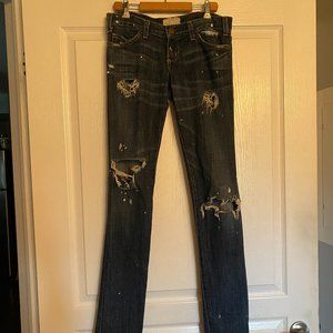 Great distressed low-rise Current/Elliot jeans in deep blue with white paint splatter accent. The jeans are pre-owned, and although only worn a handful of times, two belt loops on the back ripped off in the same spot. I'm sure these could be sewed back on in you know how to sew!