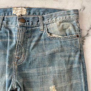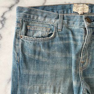 The super popular Current Elliott The Boyfriend Denim in Tattered Destroyed wash. Roll up or down, a looser, baggier fit meant to be worn low rise. Extremely comfortable, can be dressed up or down. The perfect edgy pair of denim.