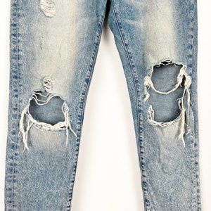 Found: the perfect boyfriend jean. Featuring fading and shredding for a distressed look, these light blue denim wash jeans have classic 5-pocket styling. These are the perfect light wash. Wear them with your favorite vintage tee, sneakers, and a leather jacket. Super comfortable and the rips are effortlessly cool