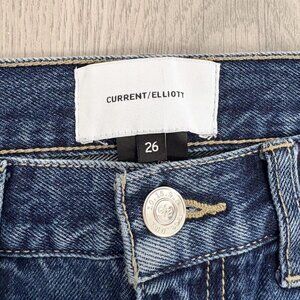 These Current Elliott "The Vintage" cropped straight-leg jeans feature a high-rise fit and stylish silver-tone studs for a standout look. With whiskered and faded detailing, distressed trim at the pockets, and a classic five-pocket silhouette, these jeans offer a perfect mix of vintage and modern style. In like-new condition, they feature a zip fly with button closure and contrast stitching. Perfect for casual wear with a stylish edge.