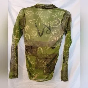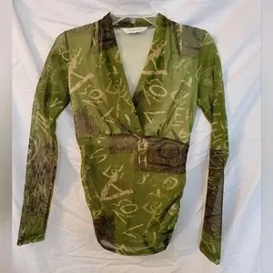 Current sheer patterned green top in size small. Sleeves and below bust is sheer. Bust area is double layered. Made in Canada. Great condition!