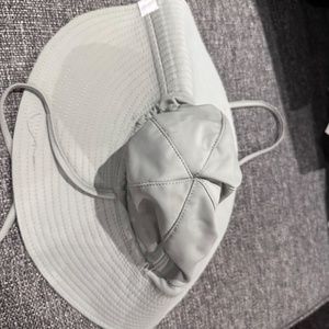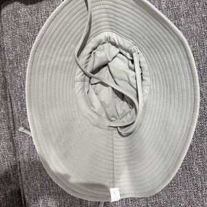 Current tyed bucket hat . Worn once but too small for my child. Adjustable meant for 6-18 months. In a greyish green. Longer at the back to protect neck. Quick dry.