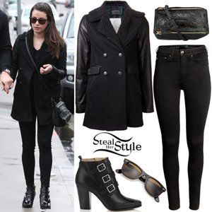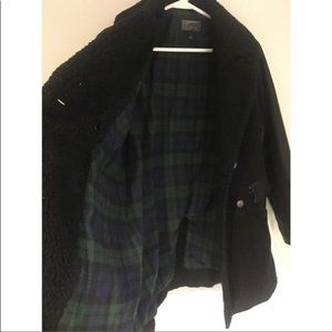 Double-breasted button front closure. Front flap and double welt pockets. Leather sleeves and pocket trim. Faux sherpa lined collar and lapels. Back slit detail. Current/Elliot size 2, 6/8 or medium.