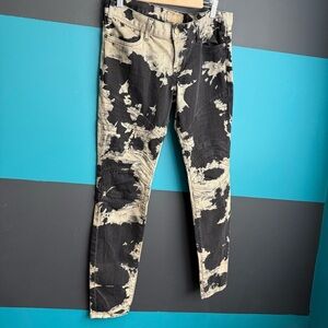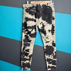 Bold tie-dye jeans with a unique pattern. Features black and cream hues. Perfect for making a statement.