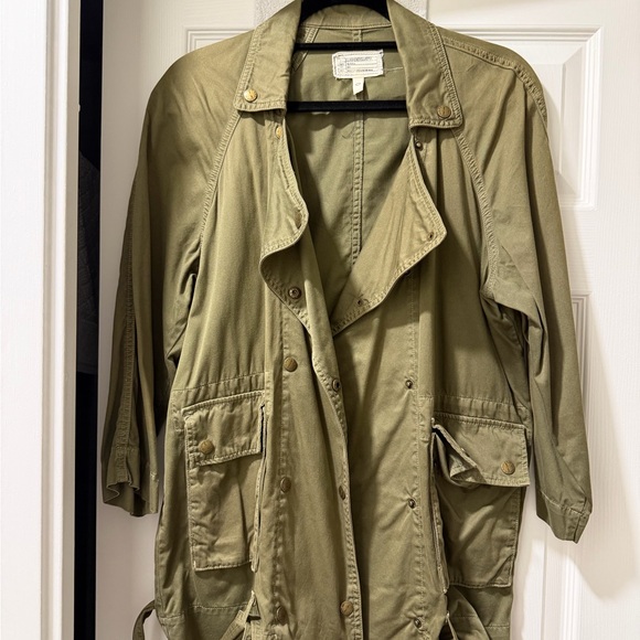 Stylish olive utility jacket with button accents. Features front pockets and drawstring waist. Perfect for layering.