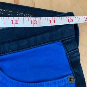 In mint condition! Exclusive collection for Barney’s New York from Current/Elliott. A dark navy blue and bright cobalt blue two tone denim jean. The denim is on the stretchier side (not like heavy Levi denim) they sit on the lower side of mid rise. Skinny jeans.