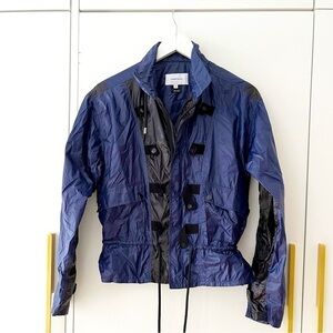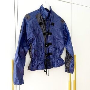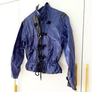 Current / Elliott blue and black windbreaker. Size 2. Pristine condition. Windbreaker with dual ties and multiple snap closures. Front pockets with snap closures. So fashionable and chic. Small hole in the lining on the inside which you cannot see at all when wearing. Tiny hole near the back of the neck. Again, minor but noting it.