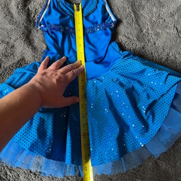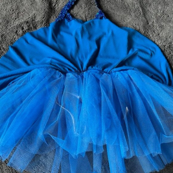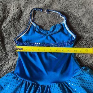 Curtain Call Devil with the Blue Dress Costume in very good used condition only worn once for recital. Has sequins on the front bodice. Skirt has a sheer layer underneath. Shiny blue material with buckle on the waist. Comes with devil headpiece and 2 red tails, choose one to pin on the back. Size is CME (Child Medium). Bodice is polyester, spandex blend with 100 % nylon bottom. We do pack our items with care; however, tutu will require steaming. Colour depends on device/screen settings and lighting in pictures. All measurements are approximate and may slightly vary. Measurements are taken by hand with item laying flat and unstretched. All items are from my smoke free home.
