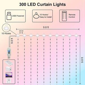 【Curtain Fairy Lights】: Measuring 9.8 ft x 9.8 ft (3 m x 3 m), equipped with 300 super bright LED on 10 drop strings and come with 10 hooks. High-quality copper wire could be easily built to any shape you desire. And these flexible mini curtain lights can provide a comfortable and relaxing environment without disturbing your eyes, creating a very dreamy room.