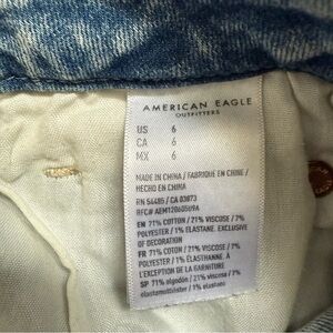 These blue jean shorts from American Eagle Outfitters feature a high-waisted design with a raw, frayed hem and distressed edges. Crafted from rigid denim, they offer a fitted silhouette through the waist and hips with a relaxed leg opening, perfect for a casual, laid-back look.