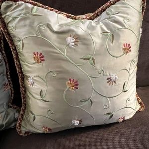 Beautiful custom silk embroidered accent pillows . 16” square with braided trim. Pale green colour in cover shot is true, while other photos are to show embroidery and trim (lighting was not great for photos).