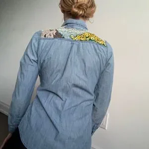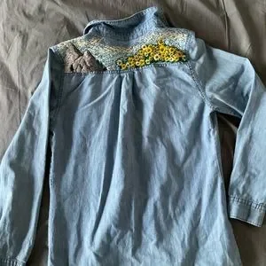 Mountain and sunflower embroidery, back details and pocket details, button up, 100% cotton, gap