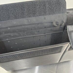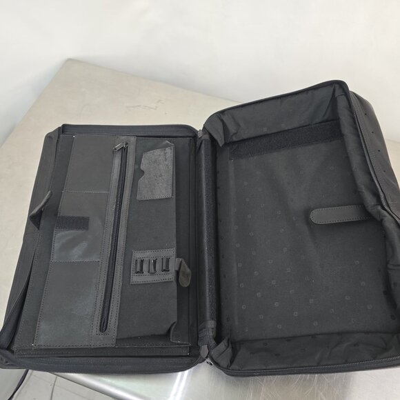 Zips fully closed with a bidirectional zip. Lots of pockets. Fit folders, a laptop, office supplies, everything you need for your presentation. Slightly padded fine leather. Rigid front and back. Fully lined. Unused. Some minor creases from being stored.