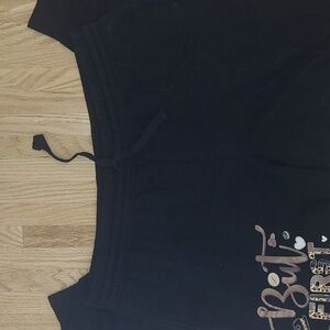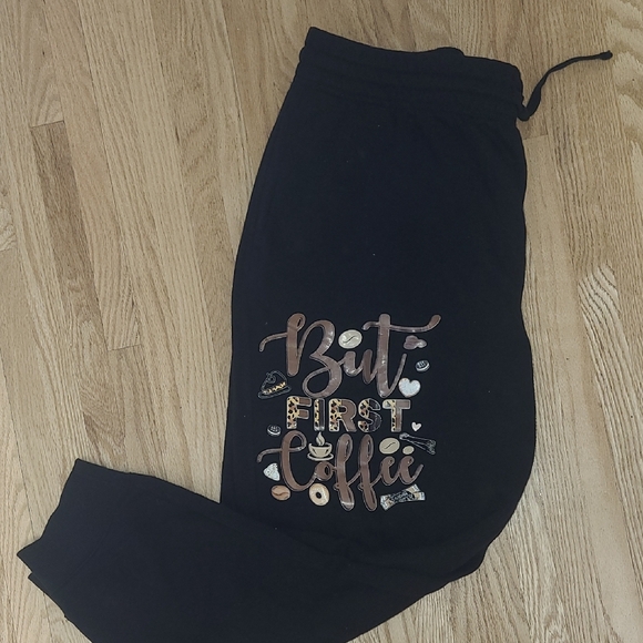 I made these but only wore them twice cause I find them too warm for me! They are black fleece joggers with pockets and a draw string waist. Coffee decal is on the right thigh.
