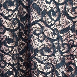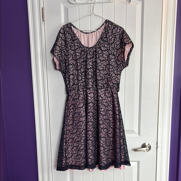 This elegant dress features a beautiful pink base with a delicate navy blue lace overlay. Perfect for special occasions, this dress combines style and comfort.