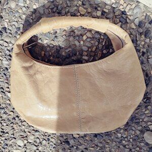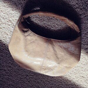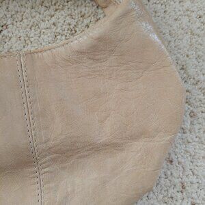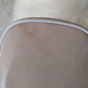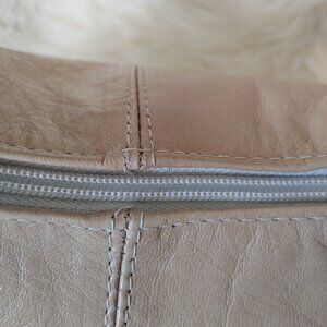 This light beige genuine leather handbag was barely used. I think it spent 90% of its life in my storage. It is a fun little handbag, but not my style anymore. Zipper opening, zipper interior pocket. Silver hardware. The rubber on the bottom has a few smudges. There are a few darker areas on the bottom. I took various photos of the inside, as you can see, that is is pristine condition.