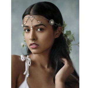 One-of-a-kind veil headpiece with pewter chain detailing, drop pearl accent, Swarovski crystals. Gorgeous floral spray sits at the back of the head, complete with vibrant peonies and greenery. The artificial florals in this piece are realistic, to the touch!
