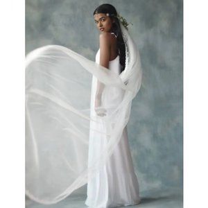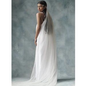 Luxurious cathedral-length Euro tulle veil rests at approximately 95 inches. The veil is finished with scalloped lace edging, truly giving this piece the 'wow' factor. Completely customizable, both the floral spray and veil can each be unhooked independently for a look that is all your own. Accompanied by a matching chain garter that measures between 18-24 inches, that is to be worn on upper thigh. This has never been worn - brand new in box. Selling for more than half off of custom price paid.