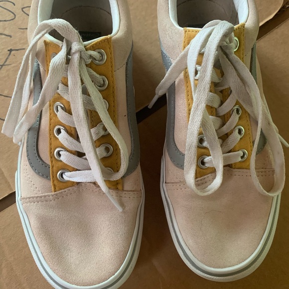 worn once or twice, some minor scuff marks but overall good condition! Pink, yellow and grey!